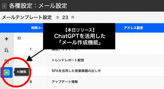 「メール作成機能」は、メール配信用の文章作成時に書式に沿うかたちでメールタイトルや本文を入力することができる機能です。ChatGPT(AI)を初めて使う方、プロンプトがわからない方でも簡単に人工知能の利点を最大限に活用することができます。