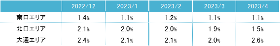 空室率は前月比マイナス0.02ポイントの2.28%となり、統計開始以来の最低値を更新した。集約移転や部分解約により現空床が発生した一方、拡張移転や建替えに伴う移転等で成約した。エリア別では「大通」が前月比プラス0.6ポイントの大幅な上昇となった。潜在空室率は前月比プラス0.01ポイントの3.48%だった。オフィス需要は活発な状況が継続し、建築中ビルにおいてもテナント誘致が順調に進んでいる。