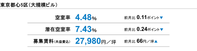 空室率は前月比マイナス0.11ポイントの4.48%となった。大口の館内増床や建替えに伴う移転により成約した。 空室を抱えた新築ビルの竣工が無かったことも低下の背景となっている。空室率は4%台半ばでの小幅な動きが 続く。潜在空室率も前月比マイナス0.24ポイントとなり、空室率同様に3ヵ月ぶりで低下した。