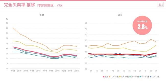 多様な働き方の調査研究機関「ツナグ働き方研究所(拠点:東京都千代田区/所長:平賀充記)」は、官公庁などが発表する労働市場関連のデータをキュレーションしつつ、分かりやすくまとめた「労働市場データレポート」を毎月発表していきます。今回は4月下旬に発表された最新データをもとに2023年3月度レポートについて、とりまとめましたのでご報告いたします。
