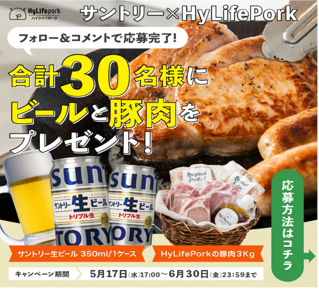 今回のコラボ企画のテーマは「相性抜群!豚肉とお酒をもっと楽しもう!」。ビールやチューハイをはじめ、さまざまな酒類を展開するサントリーと、和洋中問わずどんな料理にもぴったりの食材である豚肉を生産するハイライフが、豚肉とお酒の相性のよさをより多くの方に知っていただきたいという思いから実現しました。本企画では、6月に代官山ハイライフポークテーブル総料理長・篠嵜司とサントリーバーチャル社員の山鳥水生(やまとりみずき)さんが出演する、オリジナルコラボ動画「ポークステーキに合うお酒アレンジ3選」「ビールに合う豚肉おつまみ3選」を公開。また当社アカウントでは5月17日(水)より、「ハイライフポーク3kgセット」と「サントリー生ビール」が30名に当たるキャンペーンを実施します。