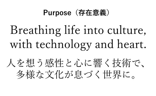 「TOPPAN's Purpose & Values」は、Purpose(存在意義)と、それを支えるValues(価値観)から構成され、Purposeを「Breathing life into culture, with technology and heart./人を想う感性と心に響く技術で、多様な文化が息づく世界に。」と設定しました。