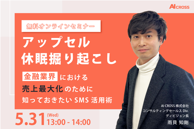 AI CROSS株式会社(本社:東京都港区、代表取締役CEO:原田典子、以下「AI CROSS」)は、当社主催の無料オンラインセミナー「アップセル・休眠掘り起こし 金融業界における売上最大化のために知っておきたいSMS活用術」を2023年5月31日(水)に開催します。