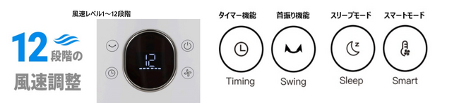 風速レベルを1~12段階で調整が出来る上、段階的に風速を弱める機能の「スリープモード」や、室内の温度に