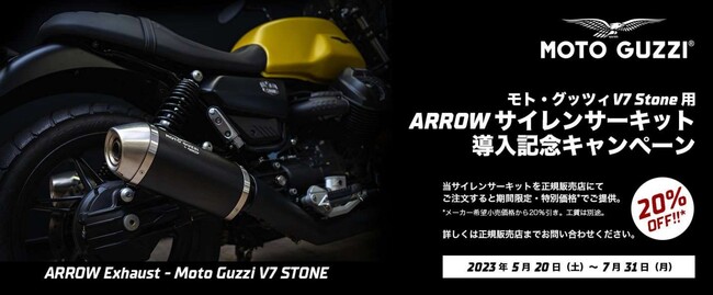 このサイレンサーキットは、2023 年 6 月より入荷が始まる特別仕様車『V7 Stone SE』に装着される物と同一 で、公道走行に必要な基準をクリアし、車検対応のエキゾーストシステムです。ブラックを基調としたサイレンサ ー部には MOTO GUZZI のイーグルマークと、製造元である ARROW のロゴを配した美しい仕上がりを誇りま す。また、このアクセサリーの発売を記念し、期間限定の特別販売キャンペーンを実施しいたします。多くの V7 Stone オーナーにお求めやすい機会を提供するこのキャンペーンは、通常の 20%OFF にてご購入いただけま す。