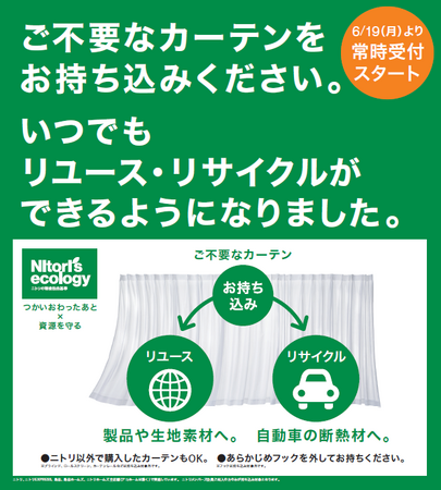 【ニトリ】ご不要なカーテンは「いつでも」ニトリへ!6月19日(月)より全店舗で常時受付スタート。