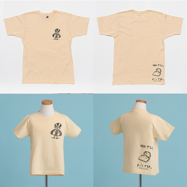 『思わず考えちゃう』Tシャツは大人用とこども用で同じイラストを使用。