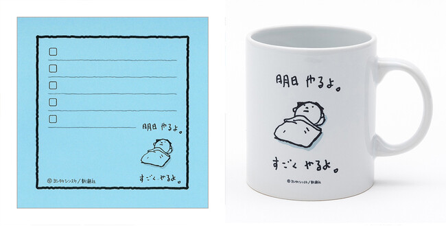 「明日やるよ」のイラストを使用したお仕事メモとマグカップが人気商品です。