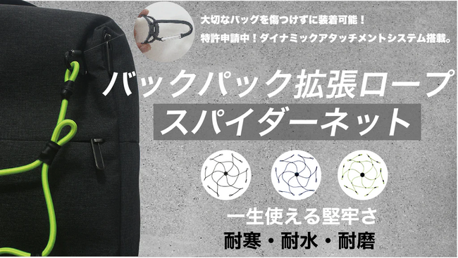 同日にクラウドファンディングを開始するのは、バックパックを拡張できる拡張ロープ「スパイダーネット」という製品であり、今通勤にも利用されるようになったリュックサック(バックパック)に対してバッグに傷を付けずにロープを繋げて、沢山の荷物を運ぶことができる便利グッズです。「手荷物を増やさず安全ですし、キャンプには最適です」(EVEBOT JAPAN代表・土屋 貴嗣)。