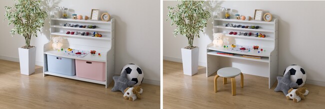 展示スペースが3段、収納スペースがボックス2個分(※)あるため、お子様が大切にしているおもちゃをコレクションしたり、遊んだりできるだけでなく、片付け時の収納力にまでこだわった商品です。
