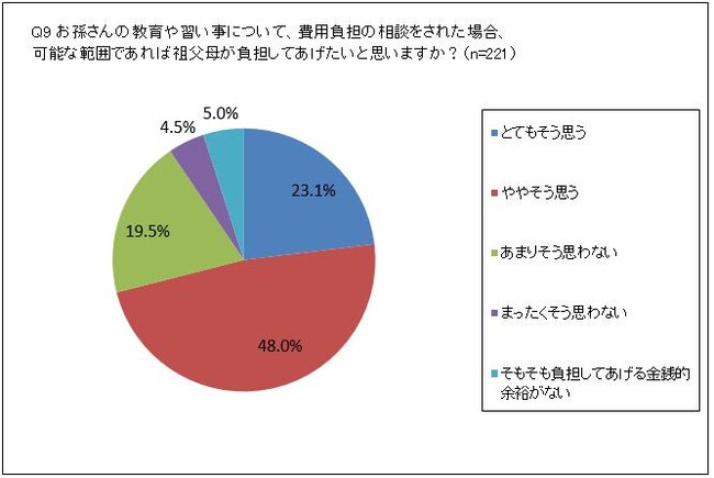 これらの結果からは、遠慮や気を遣ってしまう面があったり、孫の親を立ててあげたい・尊重してあげたいと思ったりしつつも、費用面で子ども・孫のを支えてあげたい・力になりたいと願う、祖父母の姿が見えてきます。