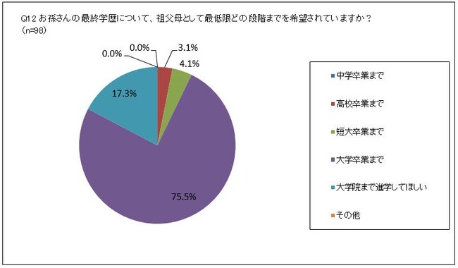 孫の最終学歴に対しての希望有無については、「ない」がやや多い結果となりましたが、「ある」と答えた方に対してどの段階までを希望するか伺ったところ、「大学卒業まで(75.5%)」がダントツで1位という結果となりました。