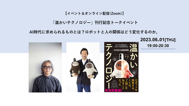 ロボットベンチャーのGROOVE X 株式会社(本社:東京都中央区日本橋浜町)は、2023年5月19日(金)の出版からわずか5日で重版出来と話題沸騰中、創業者で代表取締役社長、『LOVOT(らぼっと)』の生みの親である林要の著書『温かいテクノロジー』の出版を記念し、6月1日(木)に代官山 蔦屋書店にてJTQ代表であり『LOVOT』オーナーでもある谷川じゅんじ氏と林要のトークショーの開催が決定したことをお知らせいたします。また、6月2日(金)~4日(日)まで代官山 蔦屋書店にて『LOVOT』のPop-Upストア展示を実施いたします。ぜひこの機会に家族型ロボット『LOVOT』をご体験いただければと思います。
