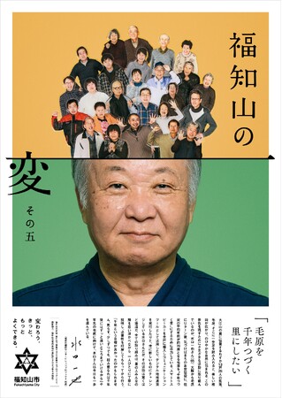 「福知山の変」のビジュアルは、“変化人”の頭の中を表しています。水口さんの「新しいチャレンジをするときは、住民みんなで話して納得したうえで行う」という信念を表現すべく、毛原の全住民26名の撮影を行い、ひとりずつアクリルスタンドに加工、組み合わせて撮影しました。そして「毛原を千年つづく里にしたい」と題し、ふるさとにUターンした水口さんが住民とともに、千年先の毛原に向けて一歩一歩進んでいくストーリーを掲載しています。水口さんは、完成したポスターを見て「まるで大家族のような全住民参加の作品になり喜んでいます」とコメントを寄せています。