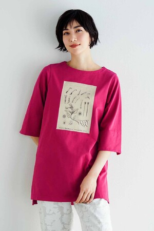 牧野博士の緻密な植物図をデザインに取り入れたTシャツです。ロング丈で体形カバーとすっきり見えを叶え、ボートネックとスリット入りの六分袖や前後差のあるスリットで、女性らしいスタイルを実現します、細身のパンツに合わせるだけでおしゃれに見えるので、夏のファッションにぴったりです。
