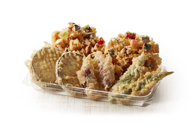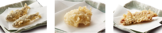 米なす・パプリカ・セロリを合わせた色鮮やかで野菜の旨みと甘みを感じられる「夏野菜のかき揚げ」と、毎年好評の「米なす」、シャキッとした食感にほのかな甘みの「ひらさやいんげん」、爽やかな香りと辛さの「みょうが」をのせて、瑞々しい国産の夏野菜を楽しめる天丼に仕上げました。