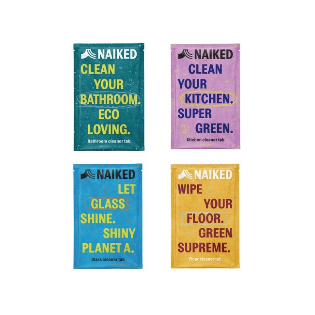 95%以上自然由来成分で作られた、水に溶かして使用する掃除用タブレット。キッチン、バスルーム、ガラス、床用の4種類。