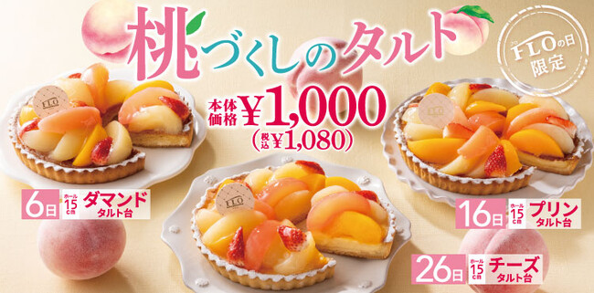 6日、16日、26日とも、6月FLOの日に続き、可愛らしい「3色の桃」をたっぷり使用したホールサイズのタルトがFLOの日限定価格・税込1080円で登場いたします(数量限定)。