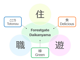Forestgate Daikanyamaでは「職・住・遊 近接の新しいライフスタイルの提案」を行い、異なるシーンがシームレスに融合することをめざしています。シームレスな融合によりONとOFFの境界が曖昧になり、劇的に移り行く時代の流れの中において、自分自身(こころ)と向き合う究極のOFF空間が求められていると考えました。本物件のデザインを手掛ける隈研吾氏と共に、贅沢な時間が流れる計画を提案します。