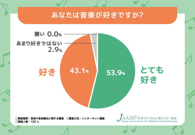 日本メディカル心理セラピー協会(本社所在地:東京都墨田区)は、全国の男女102人を対象に、「音楽や音楽療法」に関する調査をおこないました。