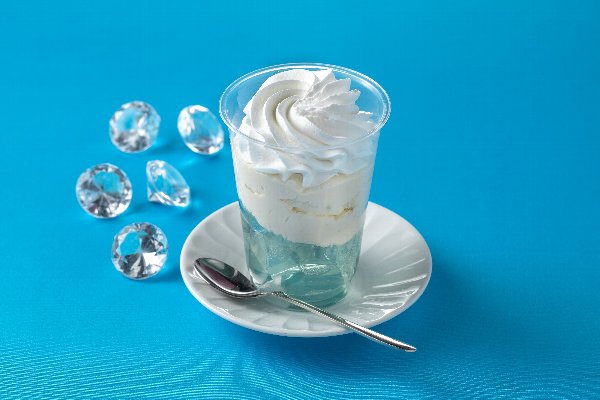 ソーダレモネードをイメージした涼やかなパルフェです。角切りのソーダレモネードゼリーとレモネードムースを重ね、たっぷりのホイップを飾りました。ソーダをイメージしたブルーの色が涼やかなパルフェです。