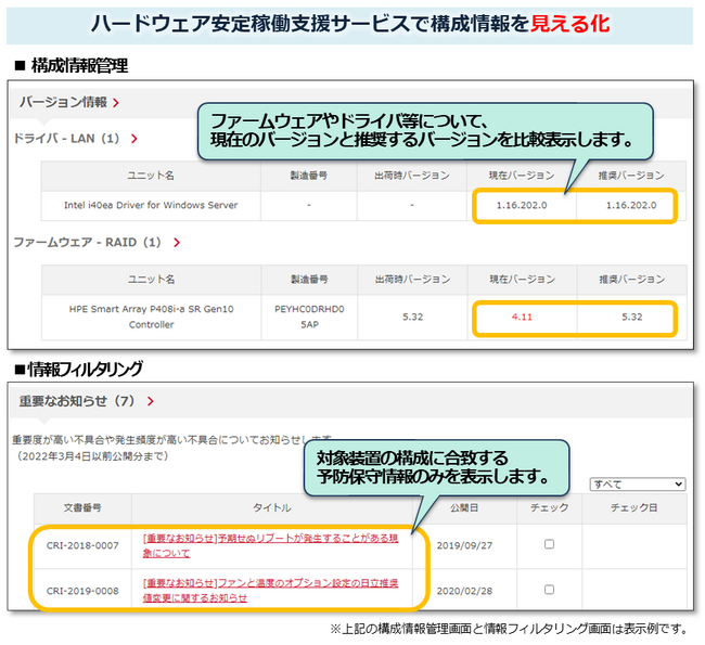 業務の集約度が上がりより重要度を増したシステムの安定稼働を継続していくためには、サーバのファームウェア・ドライバの既知不具合による障害発生を未然防止することが重要です。このたび、標準的な保守サービスメニューを強化し、当日対応のオンサイト保守作業や問題解決支援等に加えて、ハードウェア安定稼働支援サービスを1年間無償で提供いたします。ハードウェア安定稼働支援サービスでは、お客様専用サイトで、ハードウェア構成やファームウェア・ドライバ情報といった「構成情報」を提供するとともに、お客様の構成に該当する「重要なお知らせ/セキュリティ情報/アドバイザリ」を抽出しバージョン選択のサポートをいたします。これらにより、ファームウェア・ドライバのバージョン管理や更新作業の手間を削減し、作業漏れの予防を支援します。