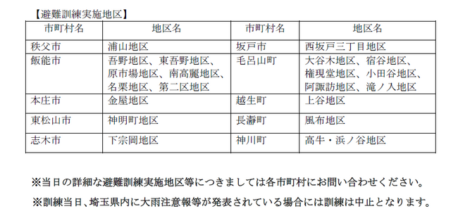 県内でも、42市町村、約1,500人が参加し、情報伝達訓練を行うとともに、秩父市ほか9市町では併せて避難訓練も実施いたします。