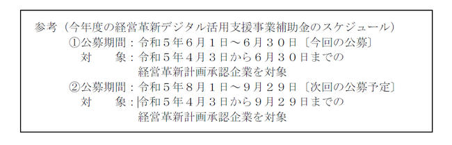 この度、令和5年4月3日から6月30日までに経営革新計画の承認を受けた(又は受ける見込の)事業者を対象とした公募を6月1日(木)から開始いたします。