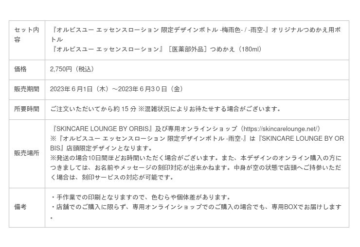 今回はtomei/透明愛好家氏によるコラボデザインとして、軽やかで透き通るような雰囲気の「梅雨色」と、舞い上がる泡のような透明感あふれる世界を表現した「雨空」の2種が登場します。「雨空」は『SKINCARE LOUNGE BY ORBIS』店頭での限定デザインとなります。「梅雨色」は店頭販売のほか、遠方のお客様にも専用オンラインショップでご購入いただけます。「梅雨の季節も、スキンケア時間を楽しめますように」といったデザインメッセージの通り、スキンケアの時間が楽しくなる限定デザインでご用意。専用のギフトBOXでのお渡しとなりますので、自分へのご褒美や大切な方へのギフトとしてもおすすめです。