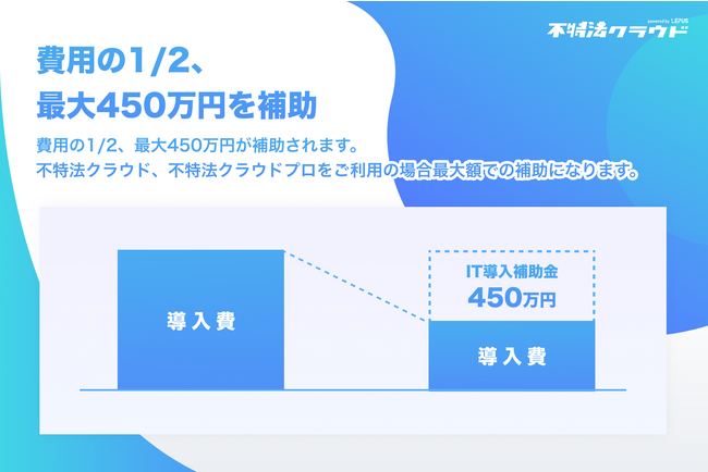 『IT導入補助金2023』を活用することで、『不特法クラウド』の導入にあたり、導入費用の2分の1(最大450万円)の補助が受けられます。