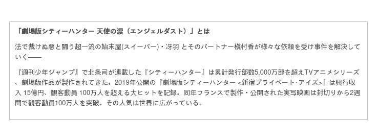 本イベントは、週刊少年ジャンプにて掲載された大人気漫画「シティーハンター」の新作「劇場版シティーハンター 天使の涙(エンジェルダスト)」の公開決定を記念し、開催する体験型ステルス潜入ゲームです。