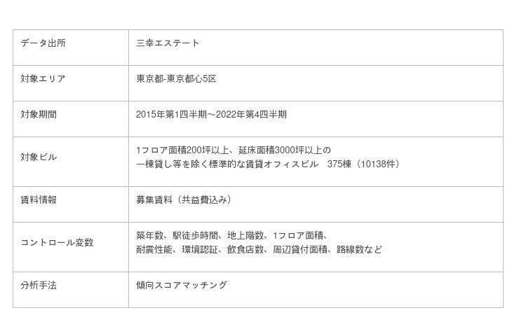 筑波大学 不動産・空間計量研究室(所在:茨城県つくば市、主宰:堤盛人 教授)と三幸エステート株式会社(本社:東京都中央区、取締役社長:武井重夫)は、賃貸オフィスビルに関する各種データを活用し、オフィス市場の動態や賃料水準に関する調査を共同で行っています。本稿では、賃貸オフィスの募集情報とアメニティに関する各種データを活用して行った、現代的なアメニティと賃料、空室率の関係に関する調査の結果を公表します。