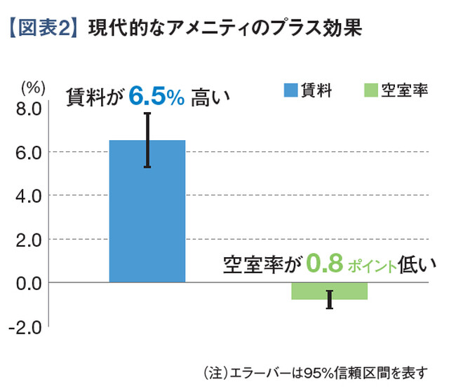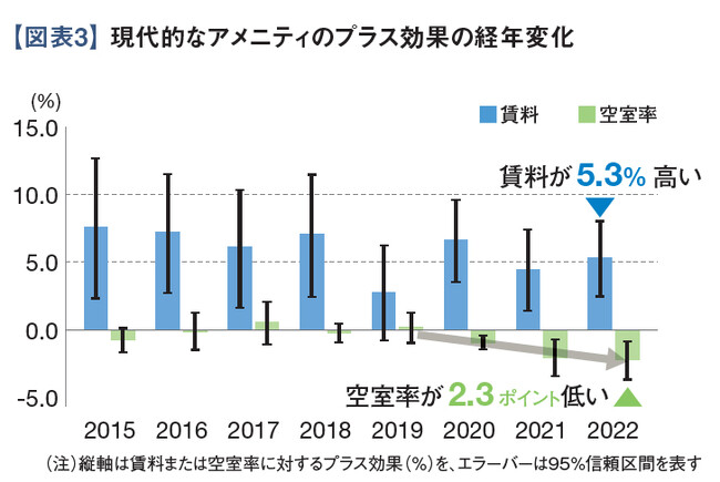 2015年から2022年までの全期間を通じた推定の結果、現代的なアメニティがあるビルは、現代的なアメニティがないビルに比べ、賃料が6.5%高く、空室率が0.8ポイント低いことが明らかになりました【図表2】。