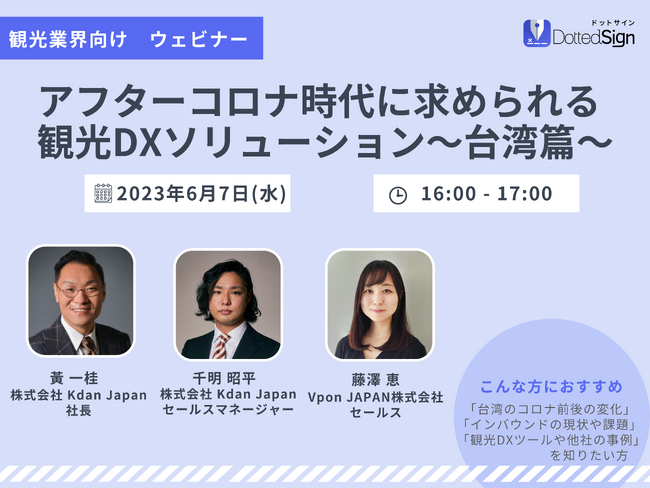 コロナ禍を契機に、観光業界でもDXの重要性が一層高まっています。本ウェビナーでは、電子契約サービス「DottedSign(ドットサイン)」を提供する Kdan Japan と共催し、台湾の最新状況や日本の観光業界が抱えている課題、それらを解決するためのDXツール活用方法をご紹介します。本ウェビナーを通して、皆様が訪日インバウンドにおける集客のヒントや新たな気づきを得ると同時に、DXによって生まれるビジネスチャンスを掴むきっかけになれば幸いです。