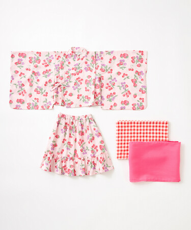 子供向け浴衣は、上下セパレートタイプのデザインで、兵児帯(へこおび)を採用し、簡単に着せ付けられ、着崩れしにくいよう工夫しました。とびきりCuteなイチゴデザイン2柄と、ちょっぴりお姉さんっぽいアジサイデザイン2柄の計4柄展開。それぞれショート丈とロング丈の2タイプがあり、計8つのデザインから選べるので、姉妹やお友達とのお揃いコーディネートを楽しんでいただけます。