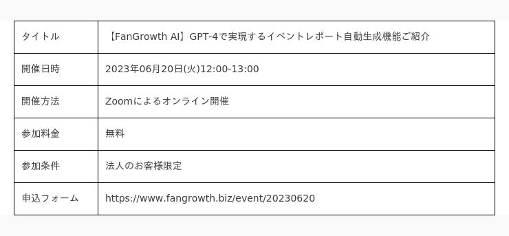 FanGrowthでは、FanGrowth AI機能を活用したウェビナーを開催します。ChatGPTを活用したコンテンツ生成や、ウェビナー実施後のコンテンツ作成に関心のある方は、ぜひご参加ください。