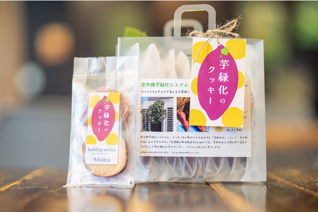 また、芋緑化では、副産物として成熟したサツマイモを収穫することができます。2022年度は合同会社渋谷肥料(所在地:東京都渋谷区、代表者:坪沼 敬広)と協業し、ウノサワ東急ビルなど3施設にて、テナントや近隣の小学生を招いた収穫イベントを開催しました。収穫された約300kgのサツマイモは、イベント参加者への配布や、焼きいもの販売、取引先様への手土産としてクッキーの製作などに使用しました。今年は、6月上旬に植え付けを実施し、10月頃に収穫を予定しています。従前より行っていたベジスマと合わせてイベントを展開することで、テナント同士のコミュニケーションの促進と省エネを両立します。