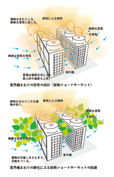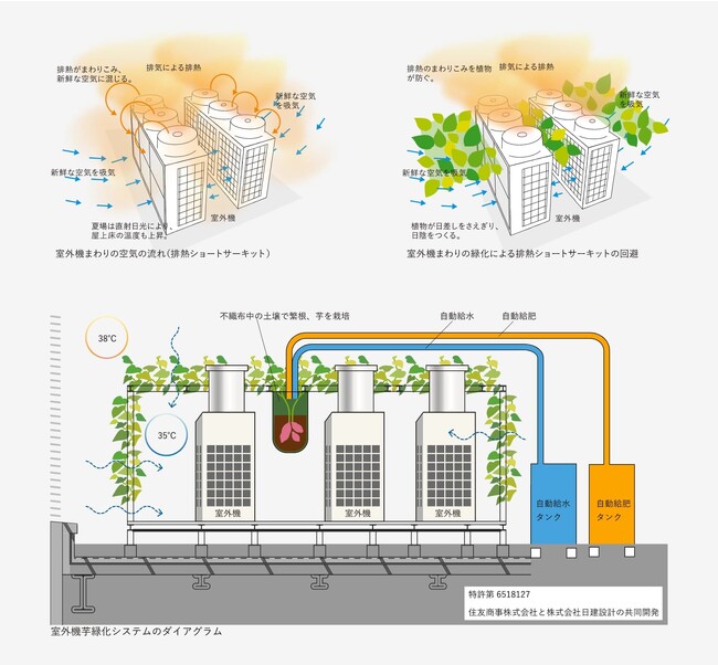 ※1 室外機芋緑化システム:株式会社日建設計(所在地:東京都千代田区、代表取締役社長:大松 敦)と住友商事株式会社(所在地:東京都千代田区:代表取締役 社長執行役員CEO:兵頭 誠之)が共同で開発した技術で、空調室外機の周りに芋の葉を繁茂させ、葉による日陰効果と蒸散作用により機器周辺の温度を下げることで空調電力の低減効果を得る仕組み(2016年特許取得済)。