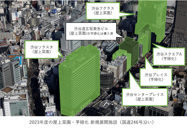 これまでのノウハウを活かし、芋緑化を取り入れたベジスマを強化していきます。当社の本社である「渋谷ソラスタ」が所在する渋谷道玄坂エリア(国道246号沿い)を重点エリアとし、2023年度は芋緑化については新たに2施設(渋谷スクエアA 、渋谷プレイス)、屋上菜園については4施設(渋谷ソラスタ、渋谷センタープレイス、渋谷道玄坂東急ビル、渋谷フクラス)に展開することで、ベジスマを行うビルは昨年度までの5施設※5から10施設(内6施設が渋谷道玄坂エリア )へと拡大します。