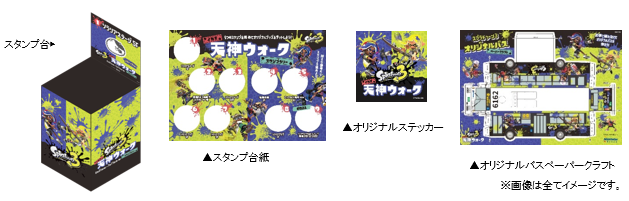 ソラリアステージ・ソラリアプラザ・福岡三越・福岡PARCO・ビックカメラ天神2号館の商業施設5か所に計9台のスタンプ台を設置し、キャラクターイラストのスタンプを集めていただきます。さらに、9種類のスタンプを全て集めてゴールすると、オリジナルステッカー(数量限定・先着順)とオリジナルバスペーパークラフトをプレゼントいたします。 ※本企画の参加は有料(税込330円)です。
