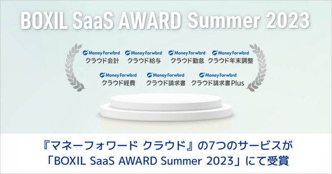 株式会社マネーフォワードが提供するバックオフィスSaaS『マネーフォワード クラウド』は、スマートキャンプ株式会社(以下「スマートキャンプ」)主催の今最も評価されているSaaSを表彰する「BOXIL SaaS AWARD Summer 2023」において、『マネーフォワード クラウド会計』『マネーフォワード クラウド給与』『マネーフォワード クラウド勤怠』『マネーフォワード クラウド年末調整』『マネーフォワード クラウド経費』『マネーフォワード クラウド請求書』『マネーフォワード クラウド請求書Plus』の7つのサービスで選出されました。