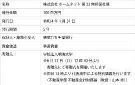 テクノロジーで気軽な住み替えをサポートする株式会社 property technologies(本社:東京都渋谷区、代表取締役社長:濱中 雄大、証券コード:5527、以下「当社」)のグループ会社である株式会社ホームネット(以下「ホームネット」)は、株式会社千葉銀行(本店:千葉県千葉市、取締役頭取:米本 努、以下「千葉銀行」)を引受先とする「地方創生私募債(愛称:みらいはぐくみ債)」を発行し、発行手数料の一部を用いて学校法人明海大学(浦安キャンパス:千葉県浦安市、理事長:宮田 淳、以下「明海大学」)の学校教育促進につながる物品を寄贈いたします。