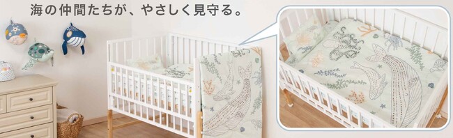 1つ1つ手縫いし立体感のある刺繍入りの寝具や、壁を彩るウォールデコレーションを追加。海の仲間たちが優しく空間を包み込みます。