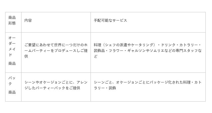 ご要望をJTBのコンシェルジュが具体化する「オーダーメイド商品」とシーンやオケージョン、目的、パーティーの参加者属性などに応じた「パック商品」の2種類を展開。提供されるサービスは、それぞれに応じたアレンジが可能です。パーティー会場も多様な場所に対応します。