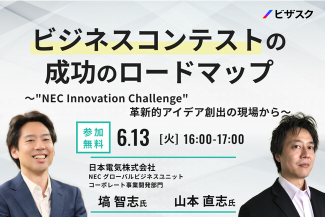 「知見と、挑戦をつなぐ」をミッションにグローバルなナレッジプラットフォームを運営する株式会社ビザスク(以下、当社)は、「ビジネスコンテスト」をテーマに、日本電気株式会社グローバルビジネスユニットコーポレート事業開発部門の塙 智志氏と山本 直志氏のご登壇による無料オンラインセミナーを、6/13(火)16時より開催します。