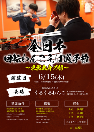 「回転わんこそば くるくるわんこ」は、TVやYouTube、雑誌など様々なメディアで話題となっており、この度新たなイベント「全日本回転わんこそば選手権」を開催いたします。この選手権は、豪華な賞金が用意されており、参加者は自身の胃袋の限界に挑戦しながら、賞金獲得を目指します。