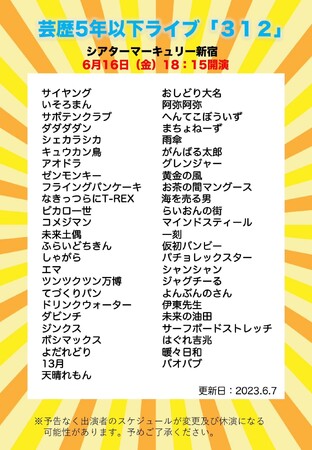 【シアターマーキュリー新宿】若手芸人によるお笑いライブ「312」開催