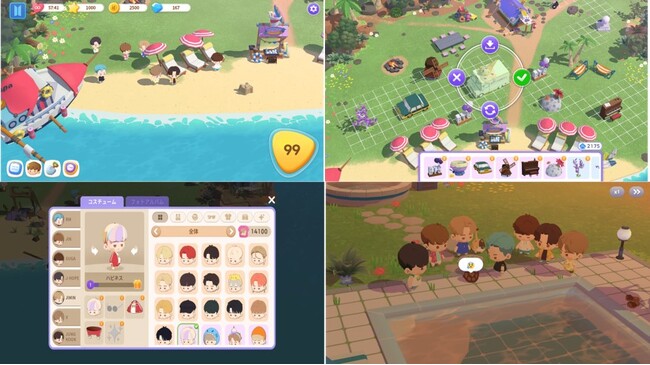 ゲームを進めるにつれ、色々なデコレーションアイテムを利用してBTSキャラクターとゲームの舞台である島を、自分だけのユニークな空間としてデザインすることができます。キャラクターが着用できる、BTSメンバーごとの実際のステージ衣装やヘアスタイル、アクセサリーなどをモチーフにしたアイテムも多数。また、「BTS Island:インザソム」でしか見ることのできないメンバーの写真も収集することができます。