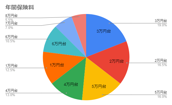 この調査によれば、一年間の自動車保険料として最も多いのは3万円台で19.0%、5万円以下(1~4万円台)が合計61%を占めています。また、1万円台の保険料を支払う人が12.5%もいるという結果は予想外でした。ただし、保険料は等級、走行距離、車両保険の有無などにより大きく変動するため、一概には言えませんが、1万円台の保険料を支払う人はおそらく18~20等級で最小限の補償プランを選んでいると考えられます。