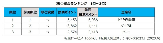 2023年の転職人気企業ランキングは、TOP3は2020年から4年連続で、「トヨタ自動車」(1位)、「グーグル」(2位)、「ソニー」(3位)という結果になりました。